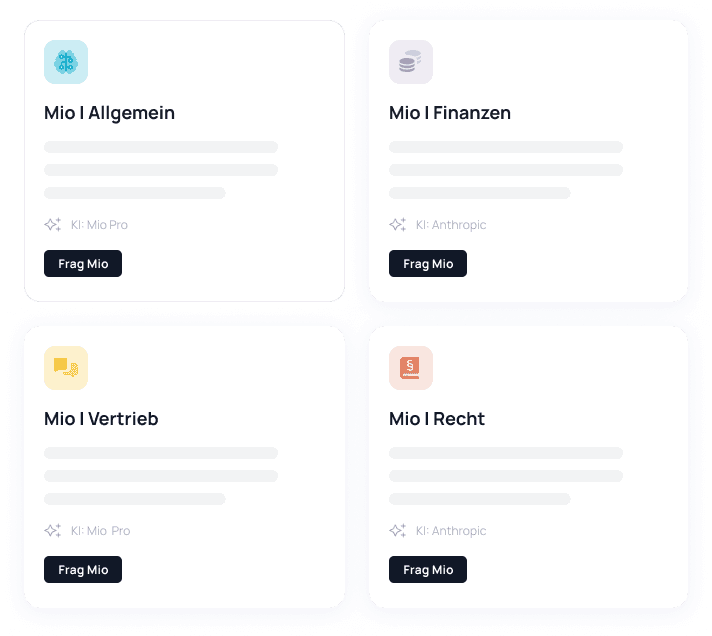 Während andere Lösungen nur einen generischen Chatbot bieten, erhalten Sie mit Mio sieben Spezialisten. Jeder für ein Fachgebiet optimiert.